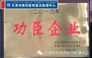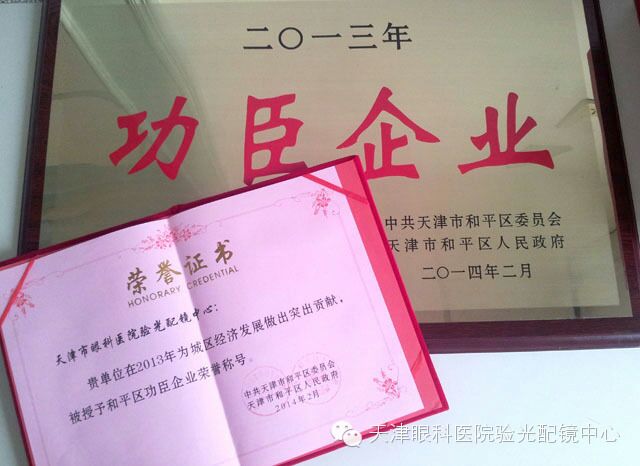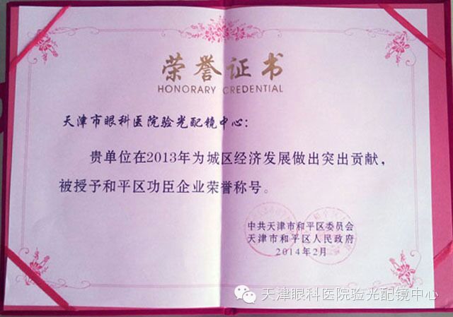 天津市眼科医院验光配镜中心在2013年为城区经济发展做出突出贡献,荣获中共天津市和平区委员会、天津市和平区人民政府颁发的2013年度和平区“功臣企业”荣誉称号