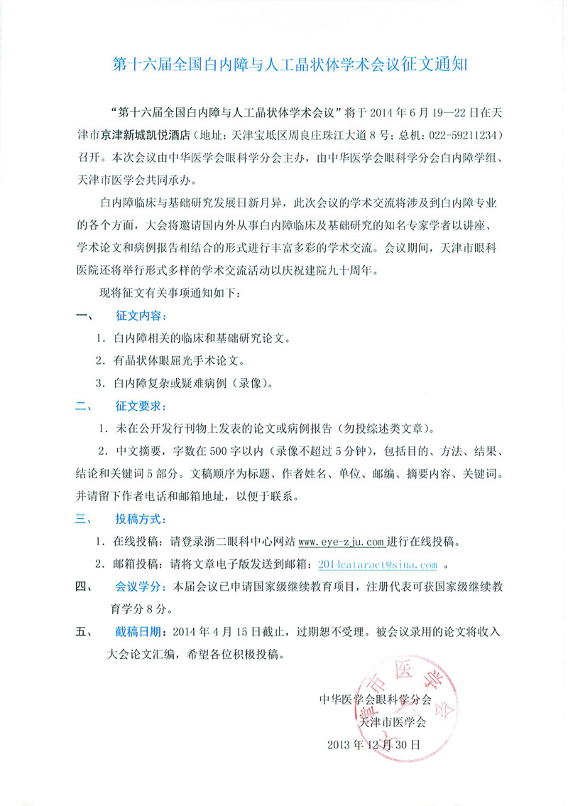 第十六届全国白内障与人工晶状体学术会议征文通知