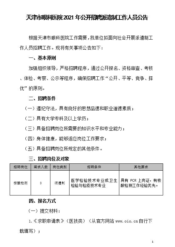 天津市眼科医院2021年公开招聘派遣制工作人员公告