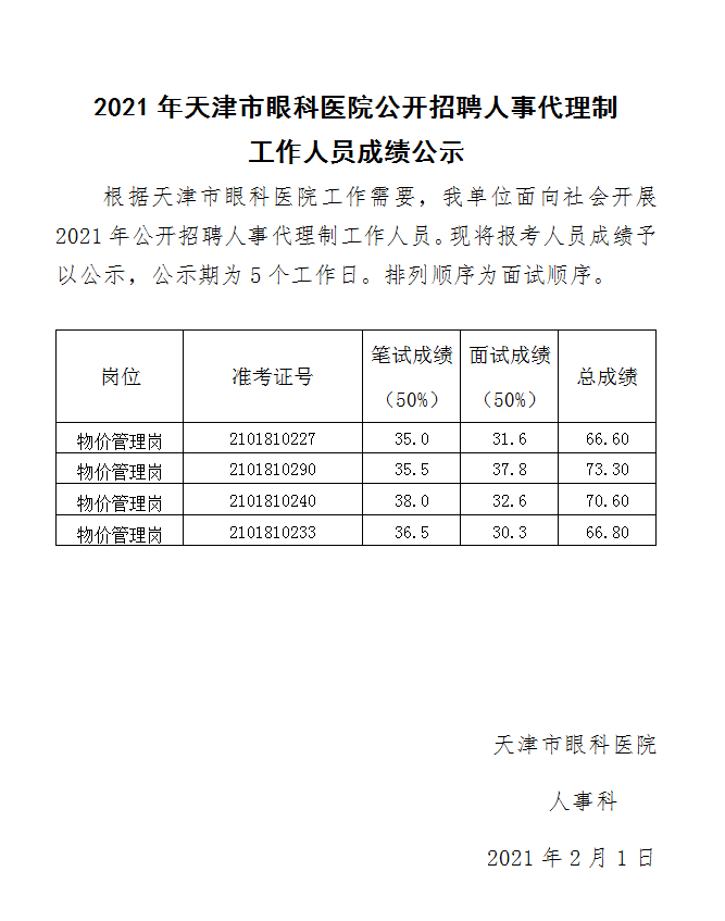 2021年天津市眼科医院公开招聘人事代理制工作人员成绩公示