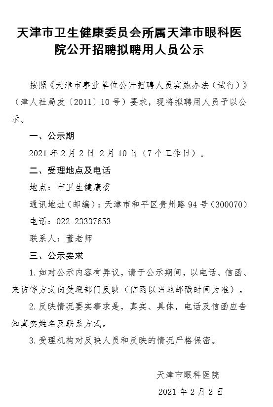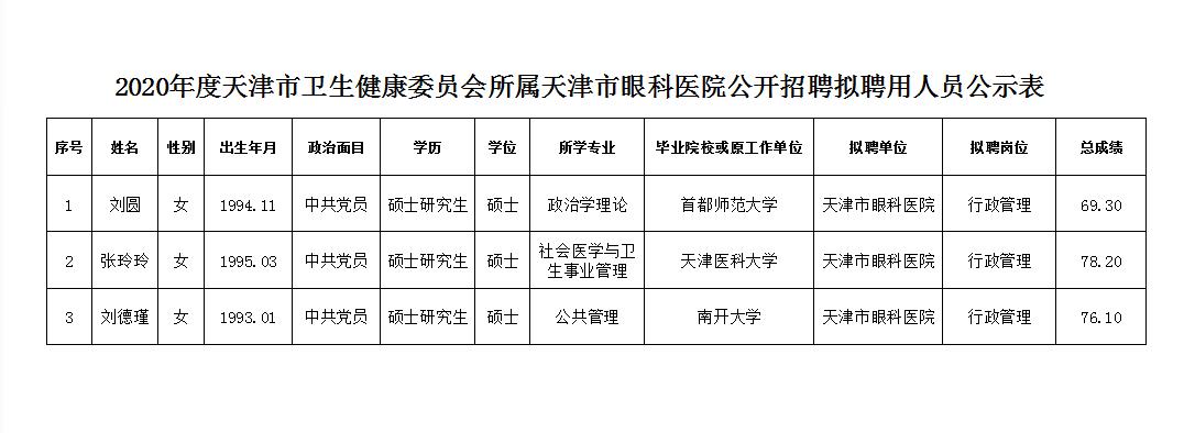 天津市卫生健康委员会所属天津市眼科医院公开招聘拟聘用人员公示