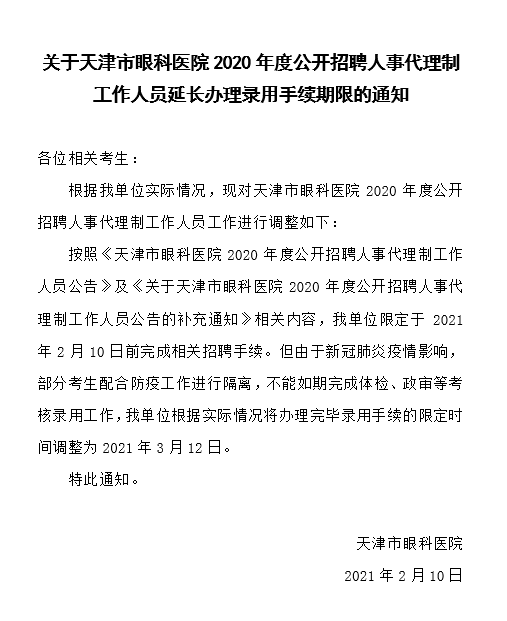 关于天津市眼科医院2020年度公开招聘人事代理制工作人员延长办理录用手续期限的通知