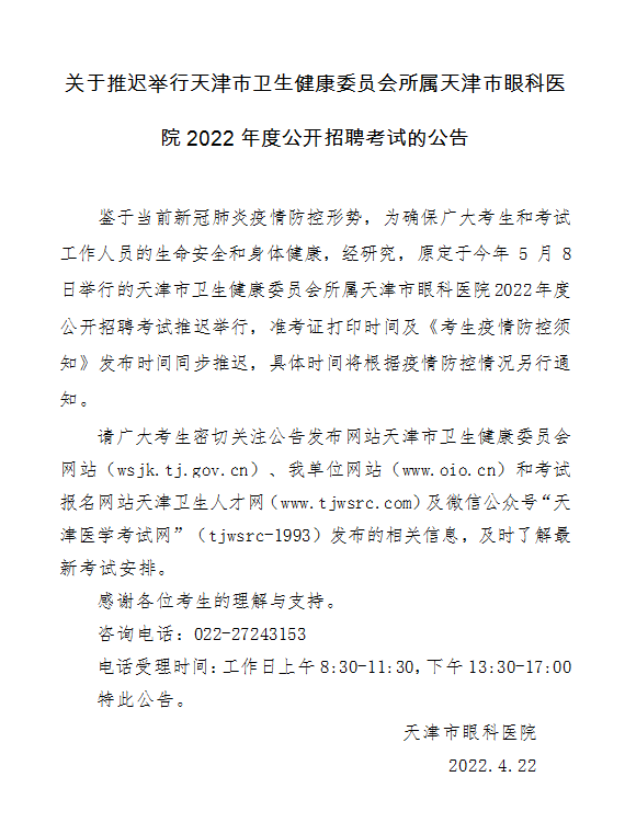 关于推迟举行天津市卫生健康委员会所属天津市眼科医院2022年度公开招聘考试的公告