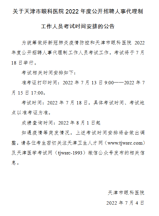 首页>>关于天津市眼科医院2022年度公开招聘人事代理制工作人员考试时间安排的公告