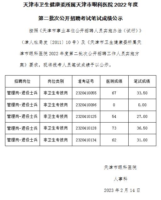 天津市卫生健康委所属天津市眼科医院2022年度第二批次公开招聘考试笔试成绩公示