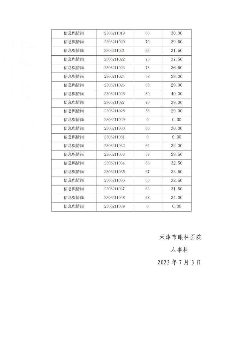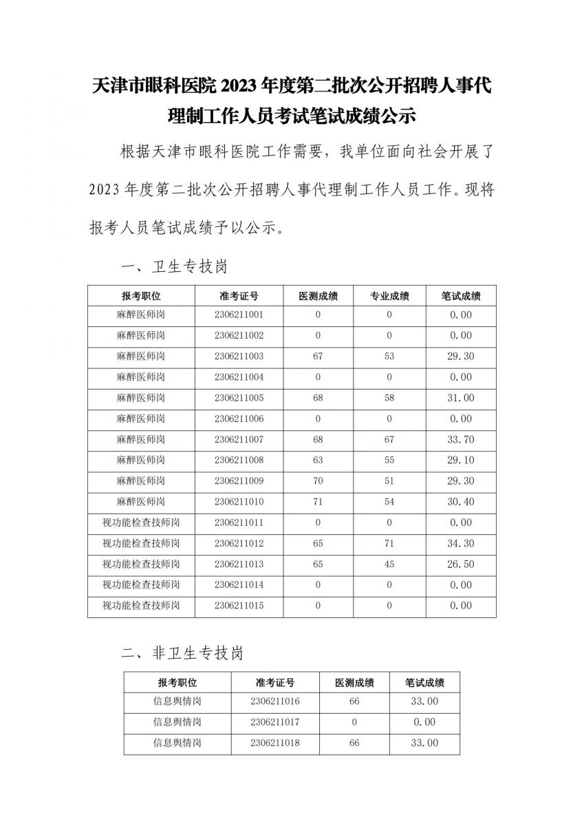 天津市眼科医院2023年度第二批次公开招聘人事代理制工作人员考试笔试成绩公示