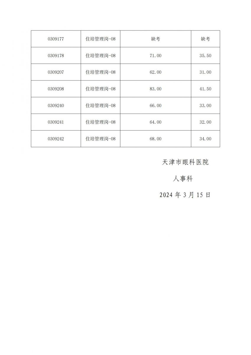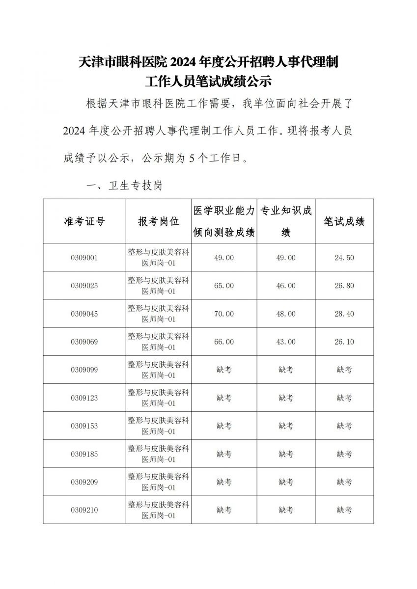 天津市眼科医院2024年度公开招聘人事代理制工作人员笔试成绩公示