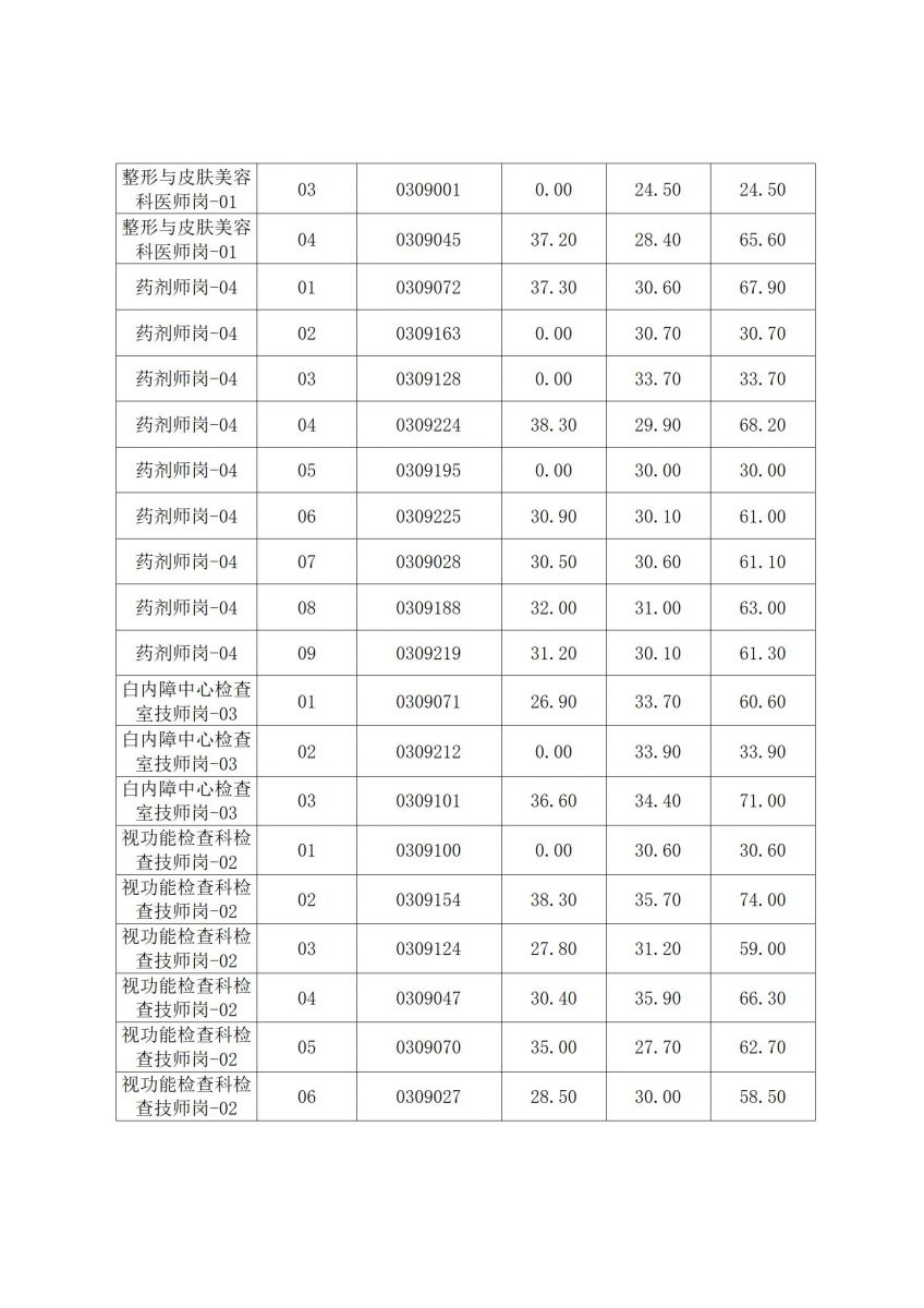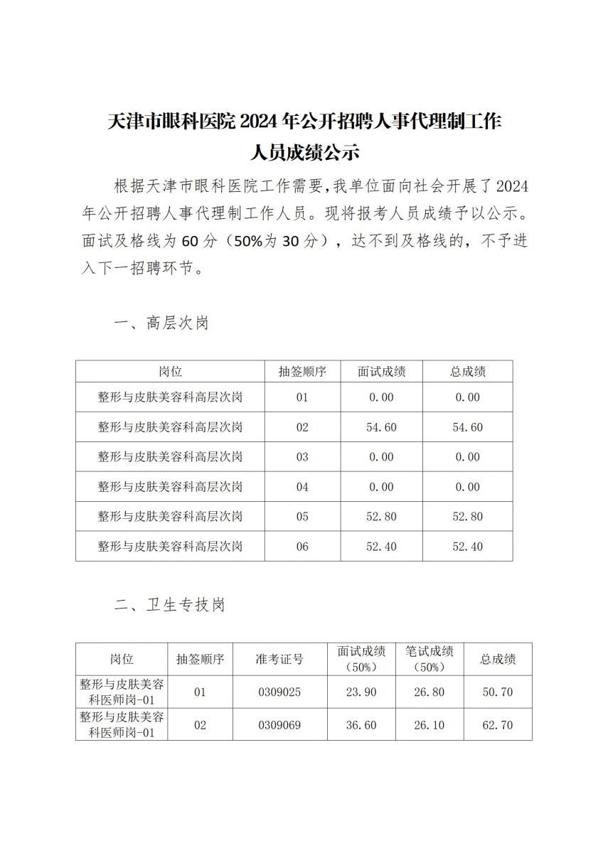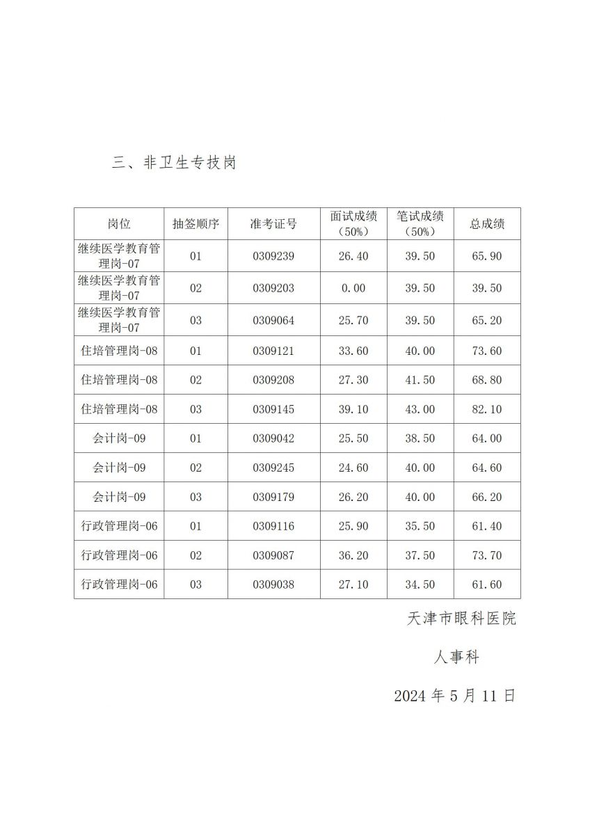 天津市眼科医院2024年公开招聘人事代理制工作人员成绩公示