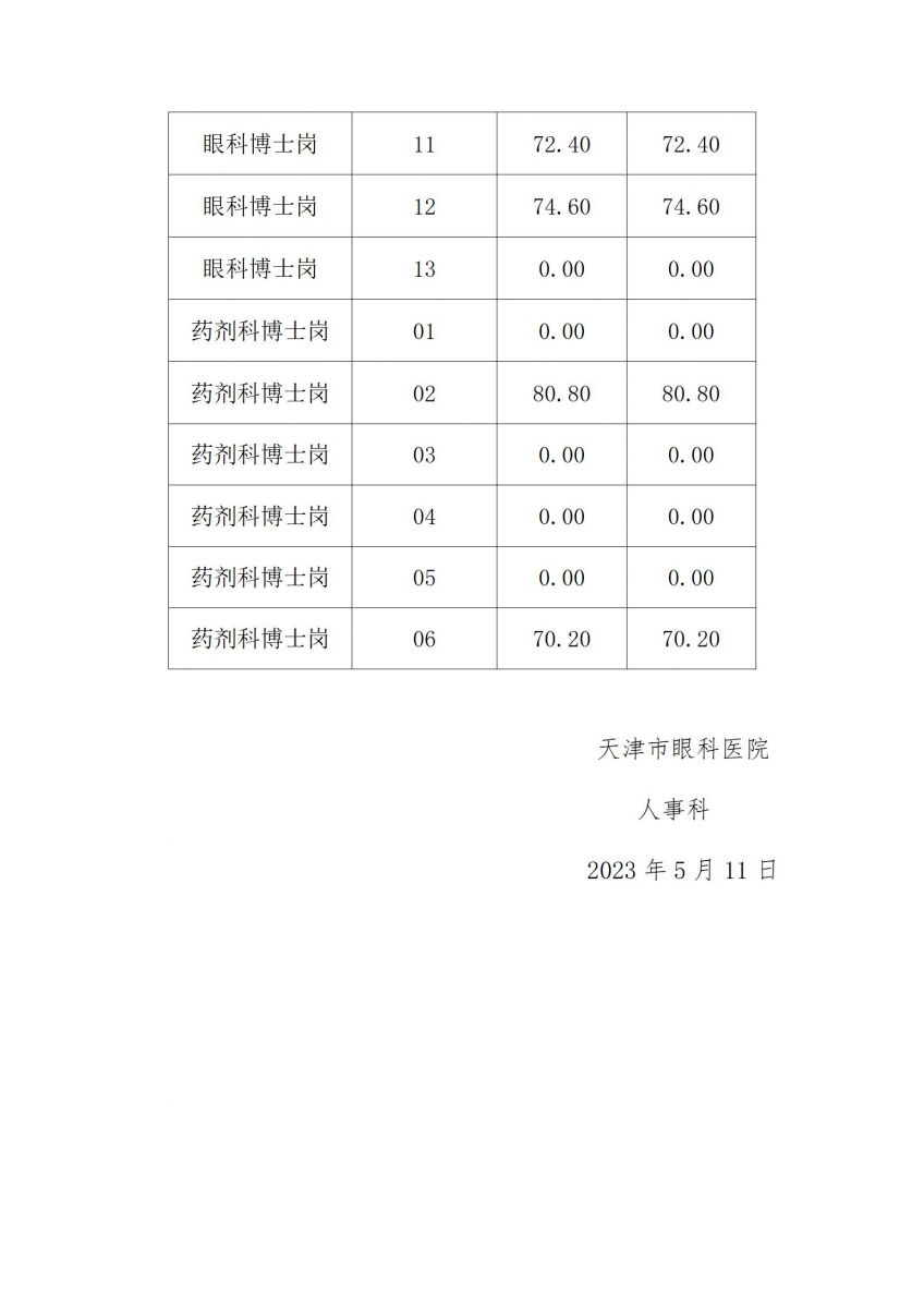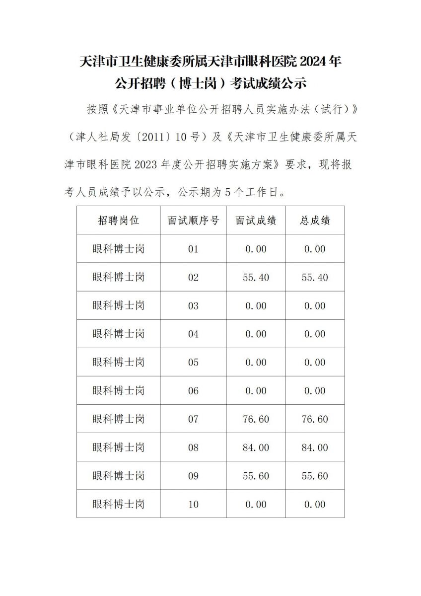 首页>>天津市卫生健康委所属天津市眼科医院2024年公开招聘(博士岗)考试成绩公示