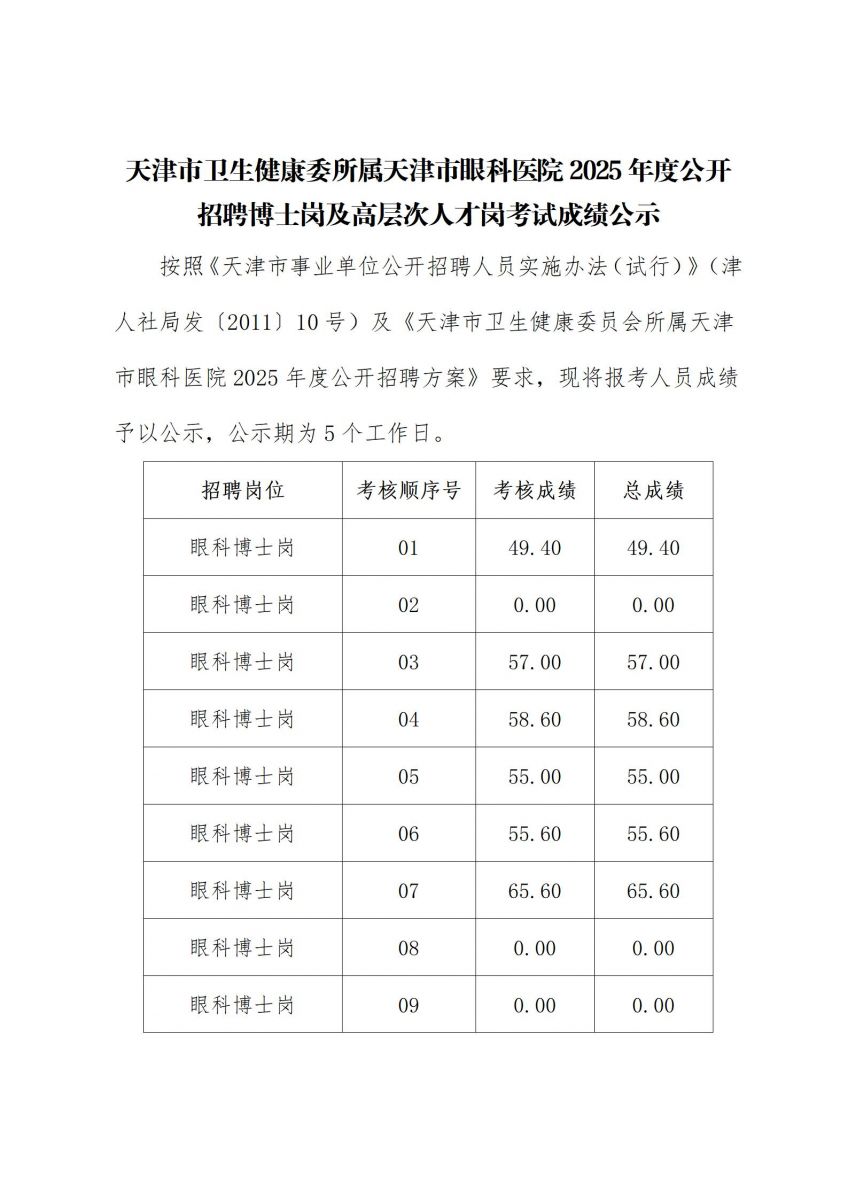 首页>>天津市卫生健康委所属天津市眼科医院2025年度公开招聘博士岗及高层次人才岗考试成绩公示