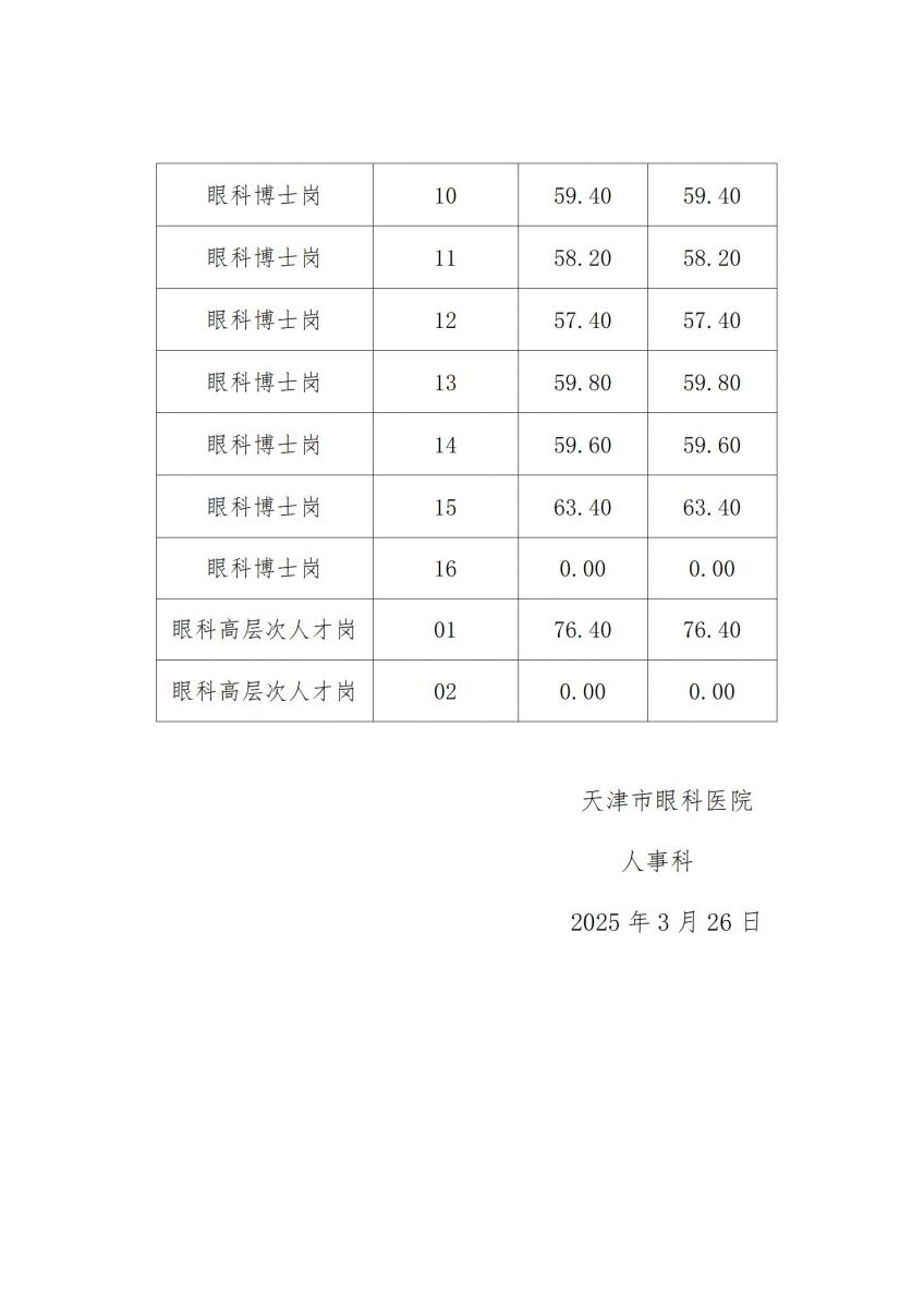 天津市卫生健康委所属天津市眼科医院2025年度公开招聘博士岗及高层次人才岗考试成绩公示