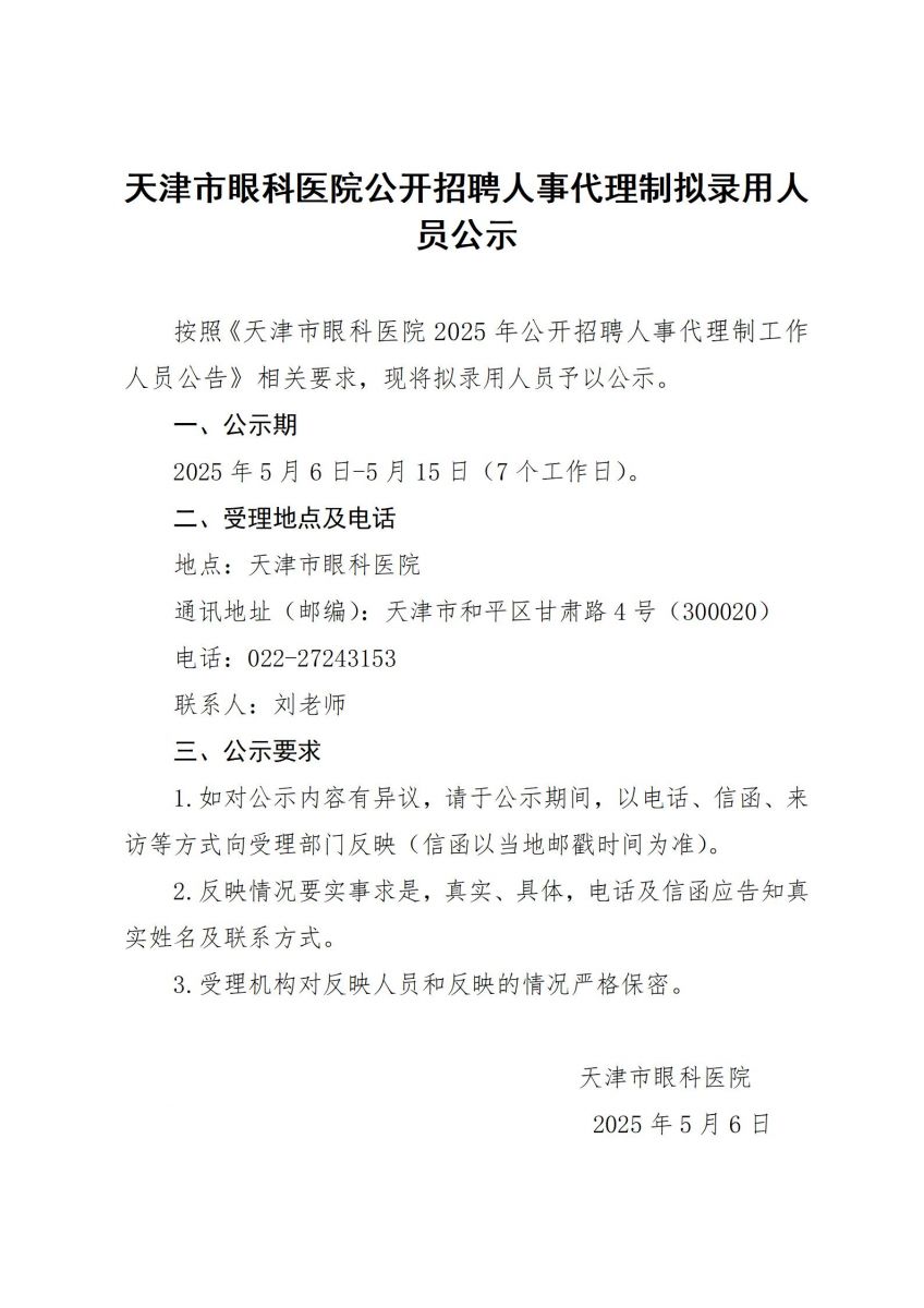 首页>>天津市眼科医院公开招聘人事代理制拟录用人员公示